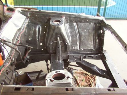 This is the bulkhead stripped of components and paint. The gearbox crossmember is seen through the opening, with the two humps for the twin exhaust pipe clearance. From the left, the large hole is for the brakes and underneath it is the flexible joint for the steering column shaft. The smaller circular hole alongside with the two studs is for the clutch cylinder. To its right and lower down is the grommet and cable for the handbrake and below it the hole for the accelerator linkage shaft. The main wiring loom is obvious, and over to the right the two copper pipes are from the heater matrix. Note the stress crinkles inherent in the stamping process of the bulkhead.